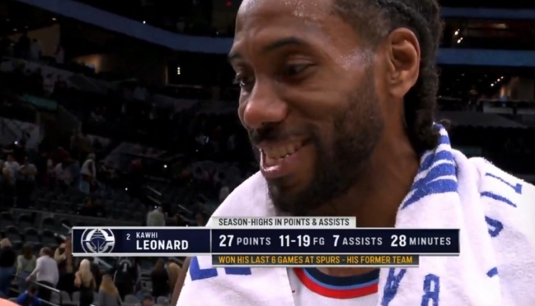 賽后,萊昂納德接受了記者采訪(fǎng)。當(dāng)被問(wèn)及自己的得分和出場(chǎng)時(shí)間接創(chuàng)生涯新高時(shí),他糾正道:“我看到了,是賽季新高,不是生涯新高。我現(xiàn)在感覺(jué)很好。我們?cè)缟系臅r(shí)候看了我的狀態(tài)如何,我們會(huì)繼續(xù)前進(jìn)。”