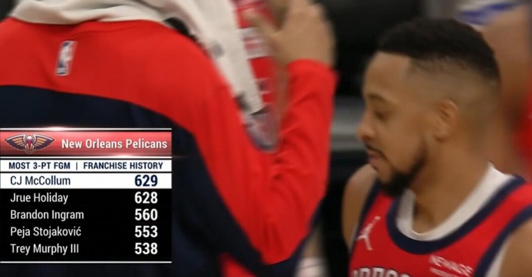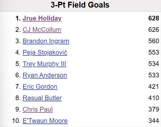 1月30日訊 NBA常規(guī)賽,鵜鶘在主場以136-137不敵獨行俠。此役,CJ-麥科勒姆出戰(zhàn)35分50秒,投籃21中9,三分7中3,罰球2中2,得到23分3籃板8助攻1搶斷。本場比賽過后,麥科勒姆鵜鶘生涯三分命中數(shù)來到629,超越朱-霍勒迪,上升至隊史第一,詳情如下:1、CJ-麥科勒姆:6292、朱-霍勒迪:6283、英格拉姆:5604、佩賈:5535、墨菲:538賽前數(shù)據(jù) 本文標簽: NBA 籃球 鵜鶘