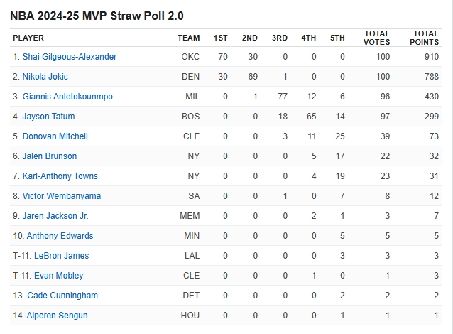 02月15日訊 在全明星間歇期到來(lái)之后,ESPN組織了100位記者、媒體人進(jìn)行了賽季第二次MVP模擬投票,亞歷山大獲得了70張第一選票,高居榜首,約基奇拿到了30張第一選票,兩人包攬了所有的第一選票;字母哥票數(shù)總分排名第三,第四是塔圖姆,文班亞馬位居第七,詹姆斯和埃文-莫布里并列第11。