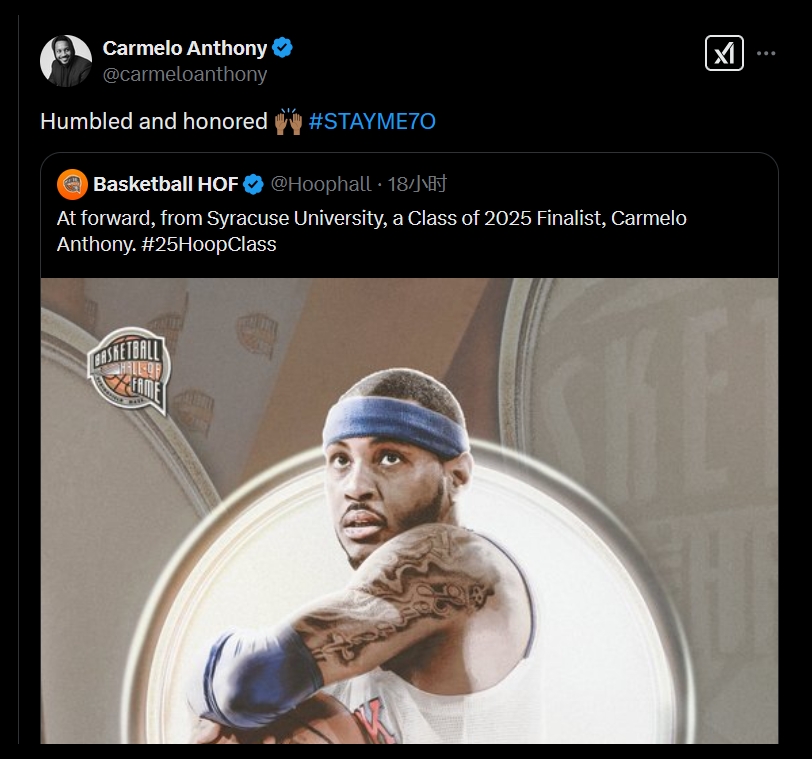 02月16日訊 安東尼更新個人社交媒體,轉(zhuǎn)發(fā)了自己入選2025年名人堂最終候選名單的新聞。