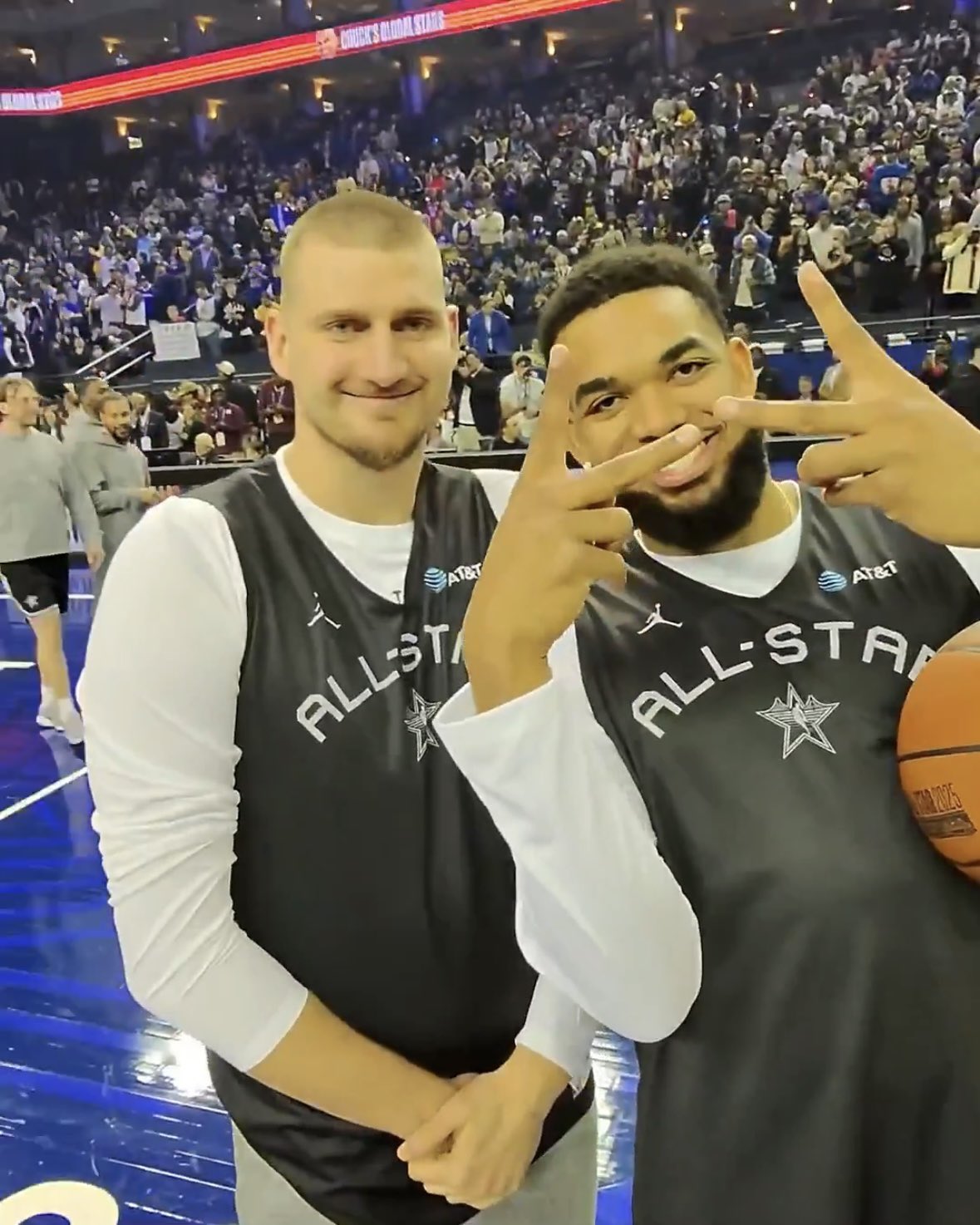 - 可愛(ài)捏!約基奇與唐斯在全明星現(xiàn)場(chǎng)合影 唐斯剪刀手&約老師姨母笑