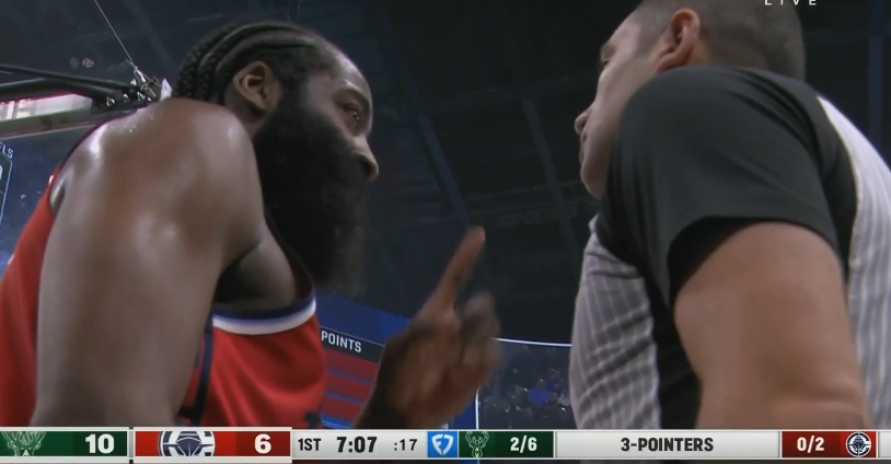 哈登突破收球被利拉德切掉 哈登非常不滿伸手向裁判表示犯規(guī)了!