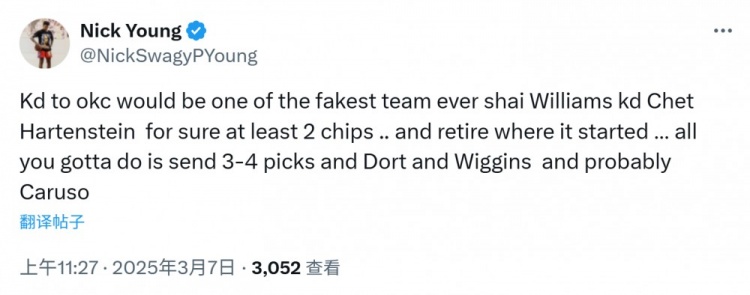 3月7日訊 今日前NBA球員尼克-楊發(fā)推談到了杜蘭特。他寫道:“如果杜蘭特去雷霆,那么他們將是史上最假的球隊。(杜蘭特+)亞歷山大、杰倫威、切特、哈滕至少兩冠。杜蘭特還能在夢開始的地方退役。你只要送出3、4個選秀權(quán)+多特+阿隆-維金斯,或許再加上卡魯索。” 本文標簽: 籃球 NBA 太陽 雷霆 杜蘭特