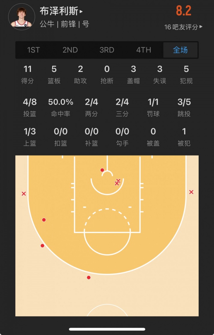 公牛11號(hào)秀 馬蒂斯-布澤利斯 登場(chǎng)29.3分鐘