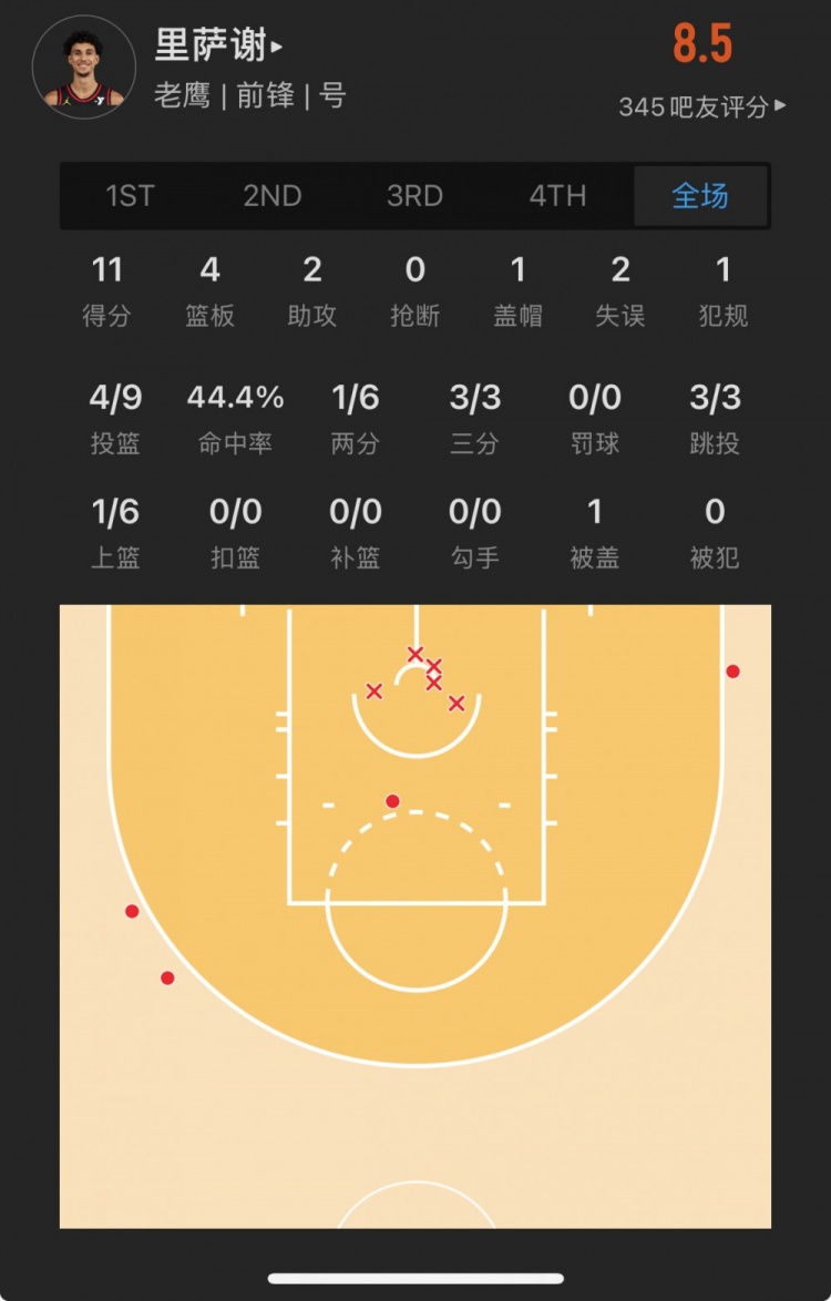 老鷹狀元秀 扎卡里-里薩謝 登場(chǎng)24.9分鐘
