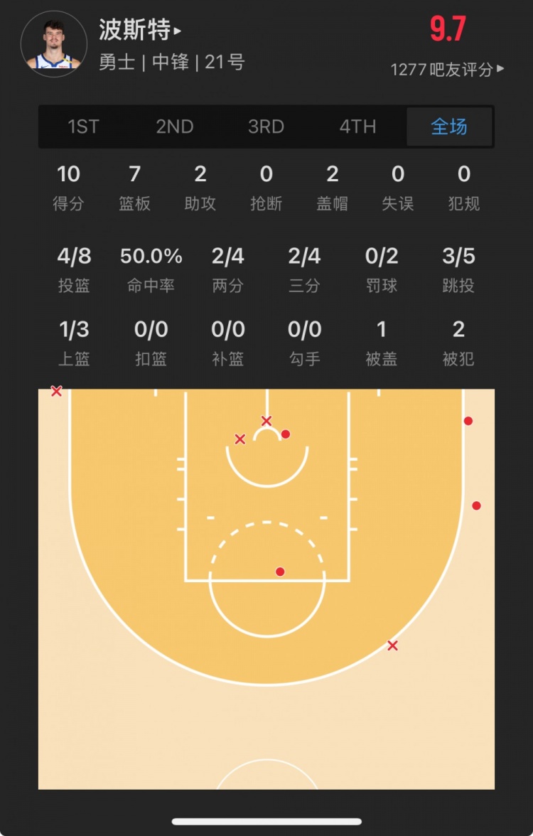 勇士52號(hào)秀 昆滕-波斯特 登場(chǎng)21.1分鐘