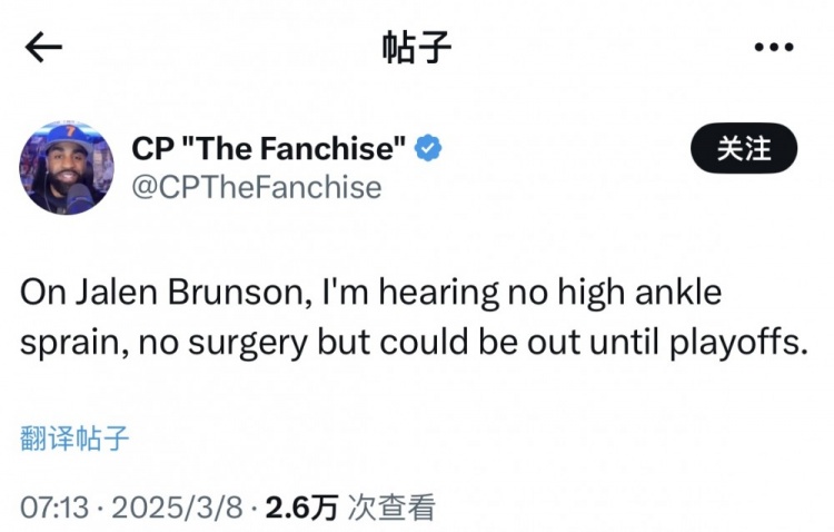 3月8日訊 今日,尼克斯自媒體博主CP“The Franchise”發(fā)推報(bào)道了尼克斯后衛(wèi)布倫森的傷情。“關(guān)于杰倫-布倫森,我聽說不是高位腳踝扭傷,不需要手術(shù)治療,但他可能要缺席至季后賽開始前?!痹摬┲鲗懙馈?/p>在昨日客場不敵湖人的比賽加時(shí)賽最后時(shí)刻,布倫森上籃時(shí)落地不慎扭傷右腳踝,隨后因傷退出比賽。 本文標(biāo)簽: 籃球 NBA 尼克斯
