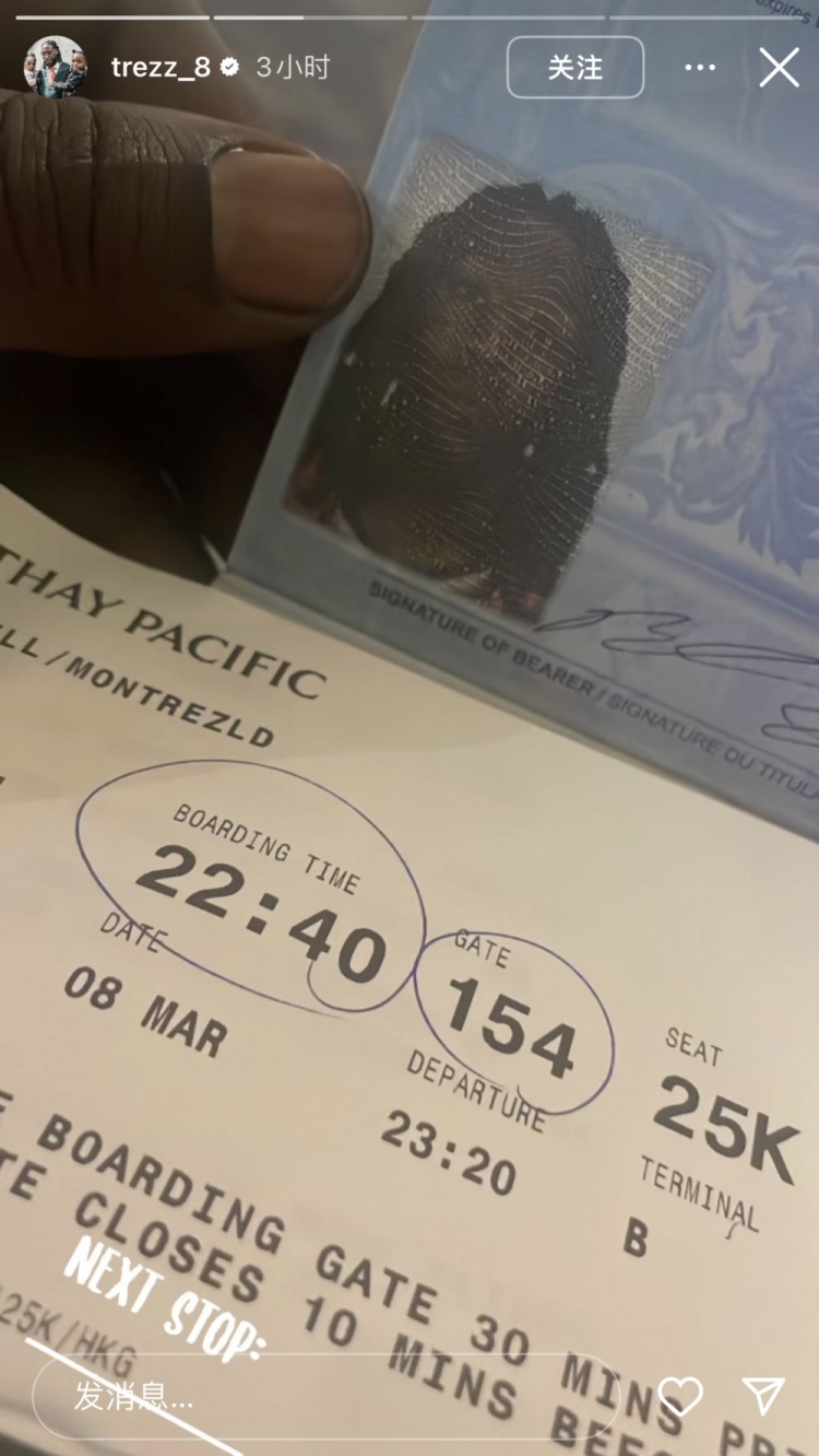 3月9日訊 哈雷爾今天更新社媒,曬出了自己的機(jī)票以及準(zhǔn)備登機(jī)的圖片。相關(guān)消息源對(duì)記者透露,哈雷爾今日啟程前往中國香港,他將在辦理相關(guān)簽證后,盡快與新疆隊(duì)會(huì)合。 本文標(biāo)簽: 籃球 CBA 中國籃球 新疆