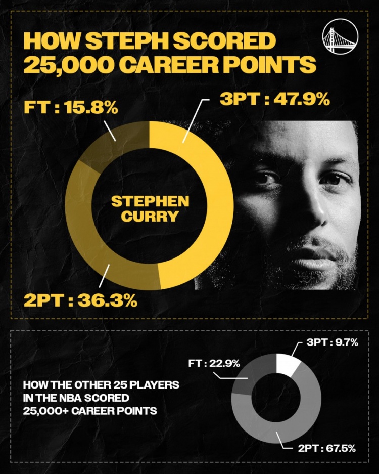 庫里25000分得分方式占比:兩分36.3%,三分47.9%,罰球15.8%;聯(lián)盟歷史上其他25位得分超25000的球員:兩分67.5%,三分9.7%,罰球22.9%。 本文標(biāo)簽: 籃球 NBA 勇士 庫里