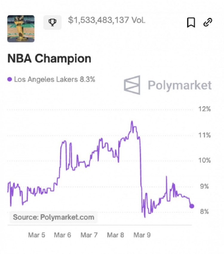 3月11日訊 今日湖人108-111不敵籃網(wǎng)。賽后美媒Polymarket更新了湖人的奪冠概率——8.3%。值得一提的是,在詹姆斯受傷后,湖人奪冠概率由11%+下降了大概3個(gè)百分點(diǎn)。 本文標(biāo)簽: 籃球 NBA 湖人 詹姆斯