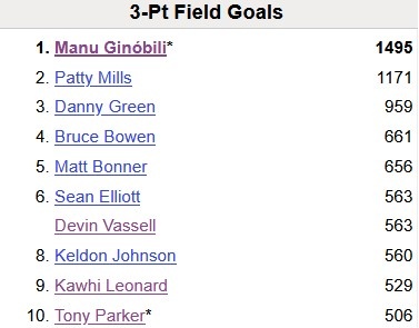 今天一場NBA常規(guī)賽,馬刺對陣獨行俠。比賽上半場,馬刺球員瓦塞爾投進一記三分。至此,瓦塞爾生涯三分命中數(shù)來到564個,超越埃利奧特,獨占馬刺隊史第6位!在他身前的是“紅曼巴”邦納(656),而高居榜首的是“妖刀”吉諾比利,他投進了1495個三分。 本文標(biāo)簽: 籃球 NBA 馬刺
