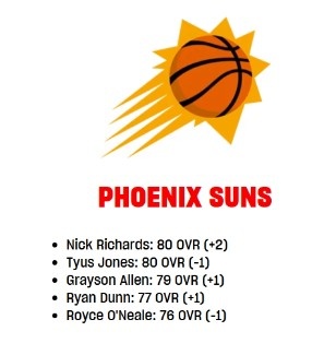 1月31日訊 NBA2K本周更新,太陽(yáng)隊(duì)內(nèi)球員的能力值有所變化,新援理查茲由78上漲至80。