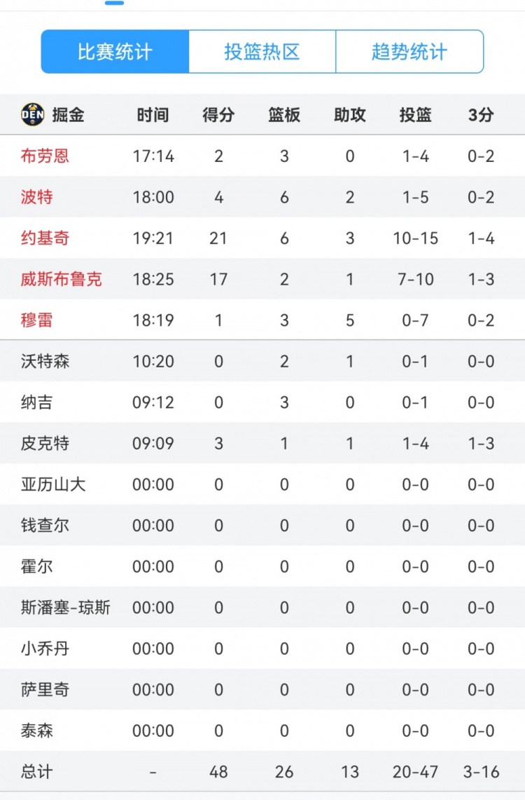 3月13日訊 NBA常規(guī)賽,掘金半場48-57落后森林狼。上半場,掘金除約基奇和威少外均表現(xiàn)不佳,全隊(duì)半場47投20中,約基奇和威少25投17中,其他人合計(jì)22投僅3中,其中賈馬爾-穆雷個人7投0中。 本文標(biāo)簽: 籃球 NBA 威少 約基奇 掘金