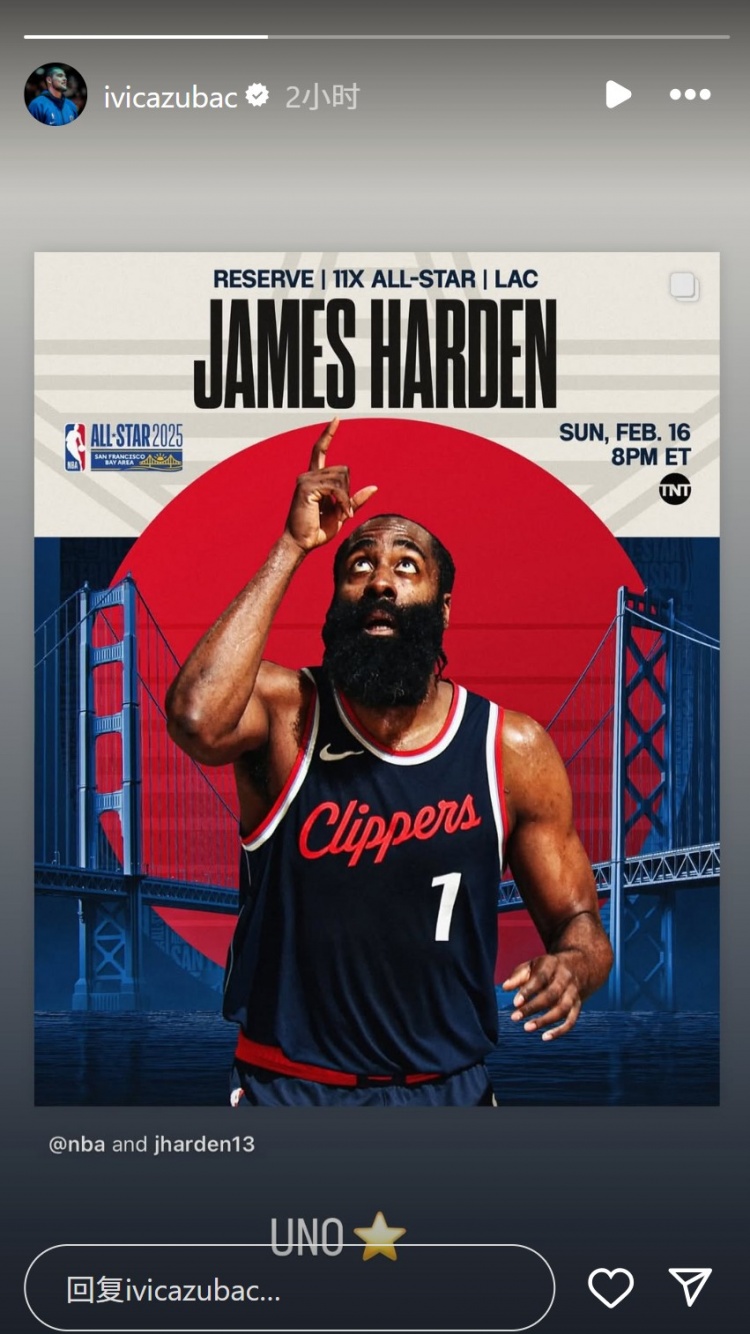 - 老大哥哈登入選全明星!祖巴茨轉(zhuǎn)發(fā)相關(guān)動態(tài):UNO?