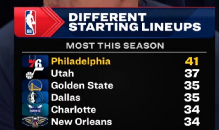 本賽季首發(fā)套數(shù):76人41套高居第一 勇士獨(dú)行俠35套并列第三