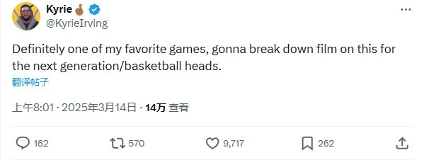 美媒寫道:“5年前的今天(2020年1月31日),歐文31分鐘砍下54分,僅投丟了4個球。”歐文則回復(fù)道:“這絕對是我最喜歡的比賽之一,我會為下一代(球員)/球迷們解析這場比賽?!?/p>