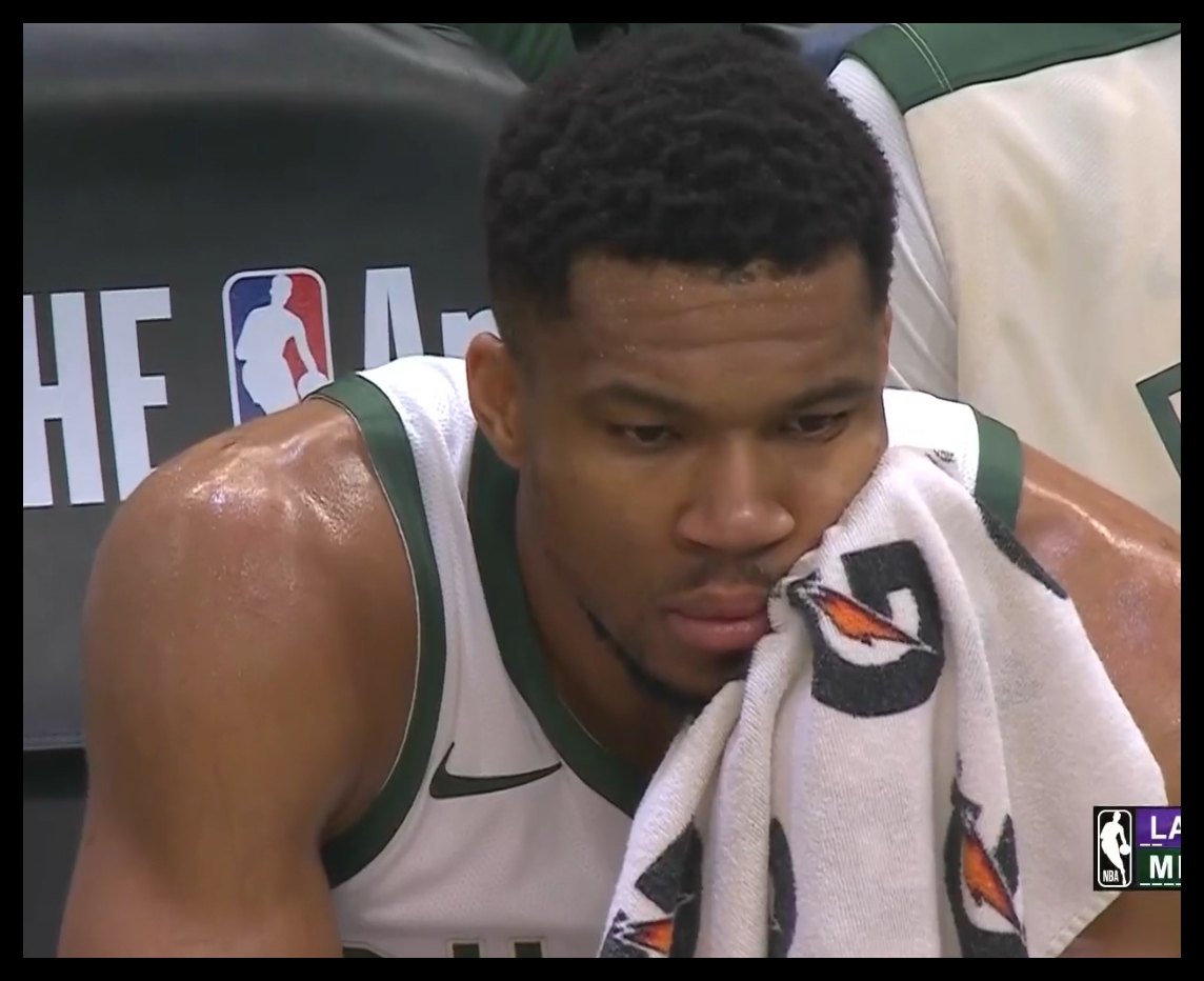 在想什么呢?雄鹿大比分領(lǐng)先湖人 字母哥在替補席若有所思~