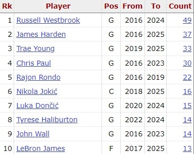 據(jù)統(tǒng)計(jì),這是威少過去10個(gè)賽季以來,第50次半場助攻上雙,為同期最多,哈登以37次排第二。
