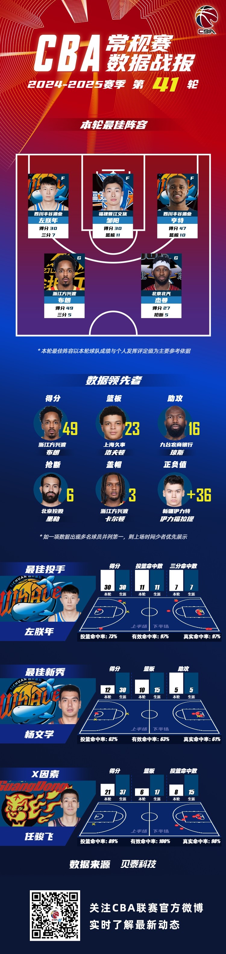 2024-2025賽季CBA聯(lián)賽常規(guī)賽第41輪結(jié)束較量,來自四川藍(lán)鯨的左朕年和亨特,福建潯興的鄒陽,浙江廣廈的布朗,北京首鋼的杰曼入選CBA聯(lián)賽常規(guī)賽第41輪最佳陣容!