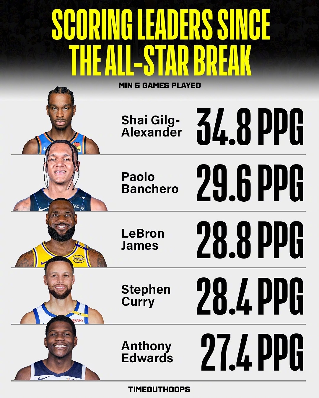 全明星后得分榜:鴨梨34.8分?jǐn)鄼n第一 班凱羅第二 詹庫(kù)分列三四位