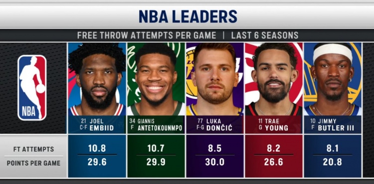 近6賽季場均罰球TOP5:恩比德 字母哥 東契奇 特雷-楊 巴特勒
