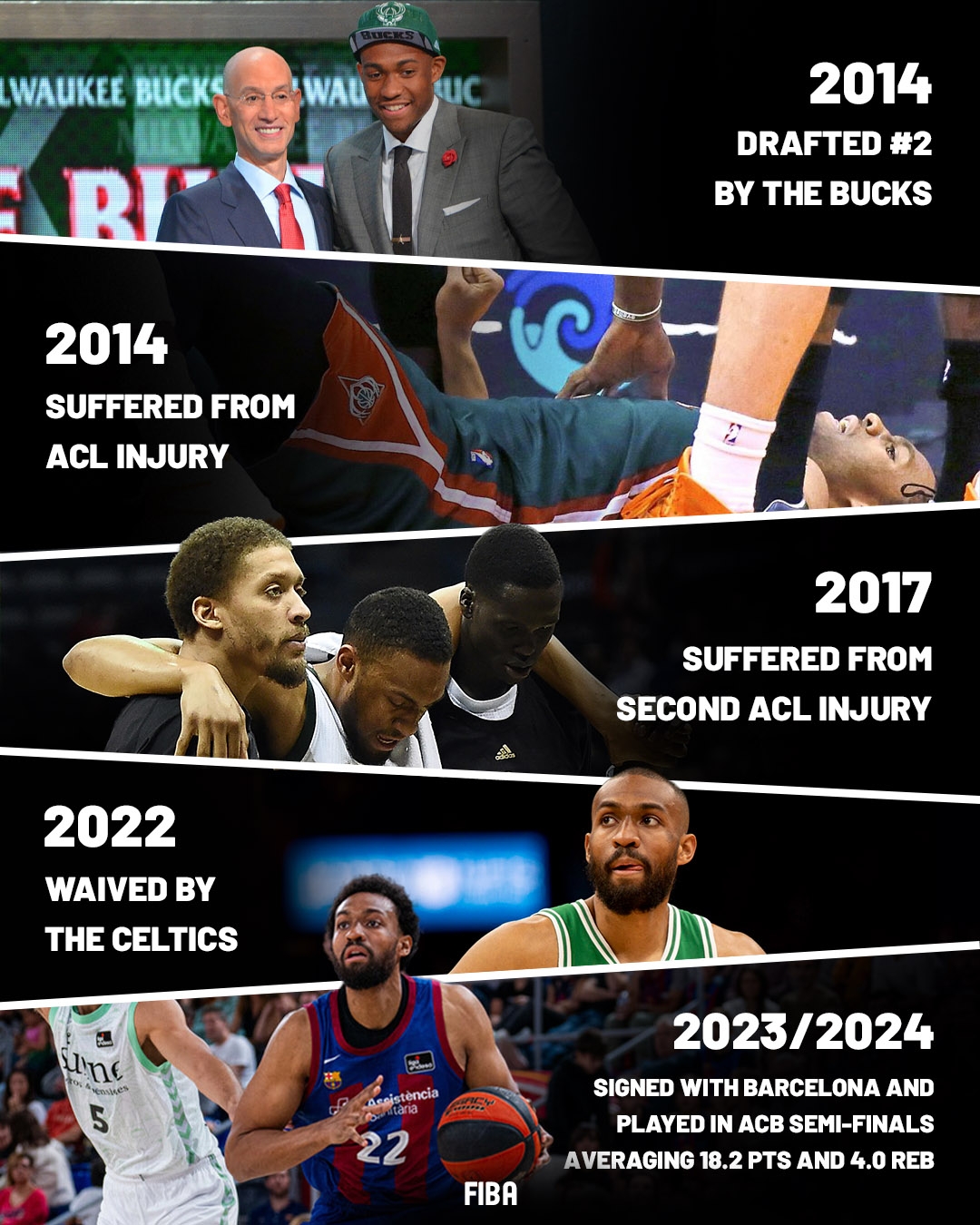 2017年第三個賽季左膝前十字韌帶再次斷裂,賽季報銷。2021-22年期間被凱爾特人裁了2次,2023-24年簽約西班牙巴塞羅那俱樂部,半決賽場均18.2分4籃板。