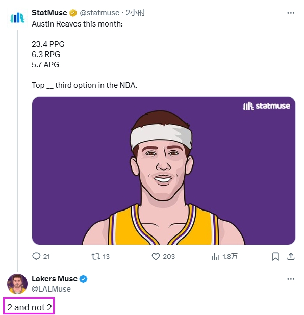 StatMuse曬出湖人后衛(wèi)奧斯汀-里夫斯本月至今的數(shù)據(jù):場均23.4分6.3籃板5.7助攻NBA前幾的球隊三當家?湖人媒體Lakers Muse評論道:“前二,但不是第二?!?/p>賽季至今,4年級的里夫斯為湖人出戰(zhàn)了60場比賽,場均上陣34.6分鐘可以攻下19.6分4.5籃板6助攻1.2搶斷,四項數(shù)據(jù)皆為生涯新高。 本文標簽: 籃球 NBA 湖人