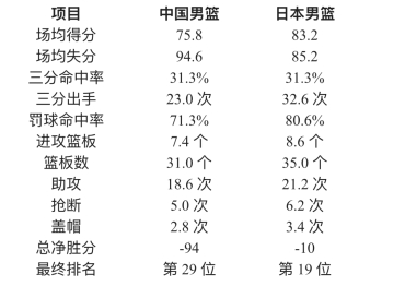 在更早的2023年男籃世界杯,中日男籃雖未正面交鋒,但日本男籃已經(jīng)在數(shù)據(jù)和排名上超越中國男籃,中國男籃和日本男籃的數(shù)據(jù)對(duì)比: