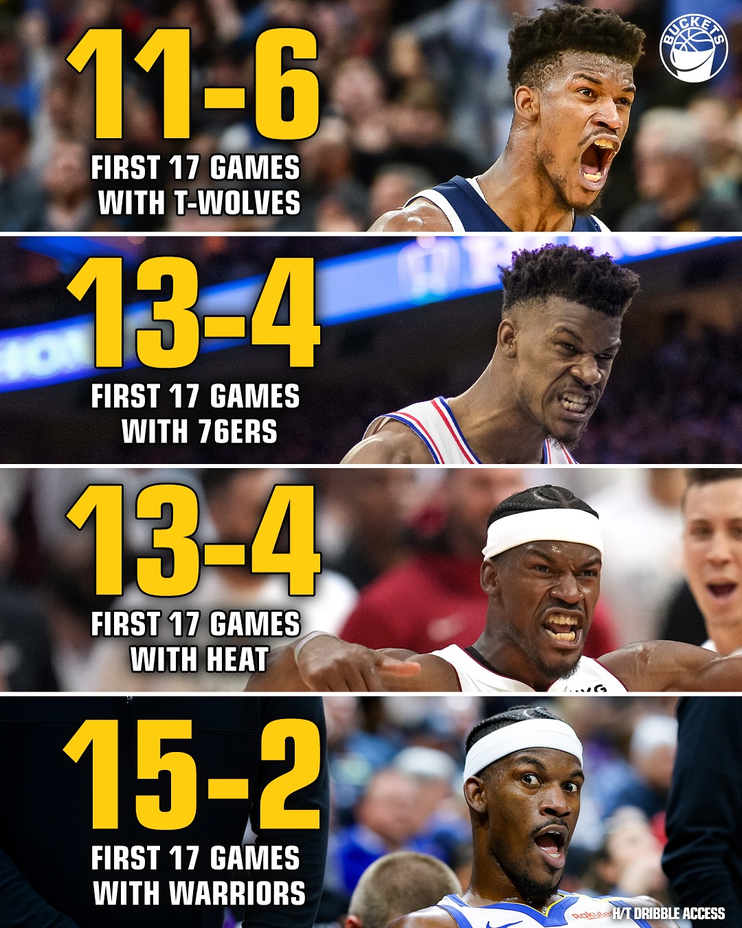 吉米效應(yīng)?巴特勒生涯四次轉(zhuǎn)會(huì)后前17場(chǎng)比賽 勇士15-2戰(zhàn)績(jī)最好