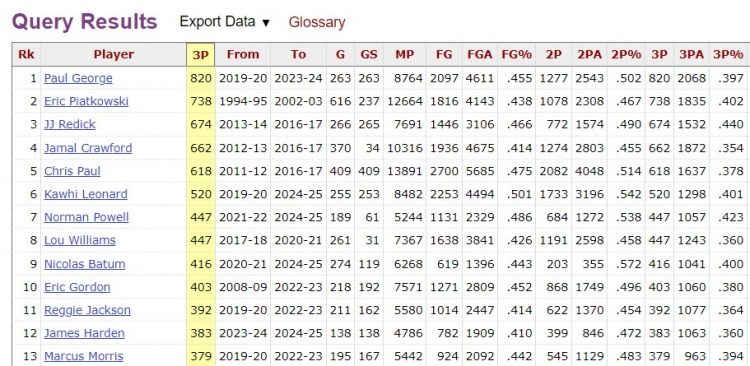 根據(jù)數(shù)據(jù)統(tǒng)計,加上已經(jīng)投進(jìn)的1個三分,鮑威爾快船生涯三分?jǐn)?shù)來到448記,他超越路威,獨(dú)居隊史三分榜第7位。