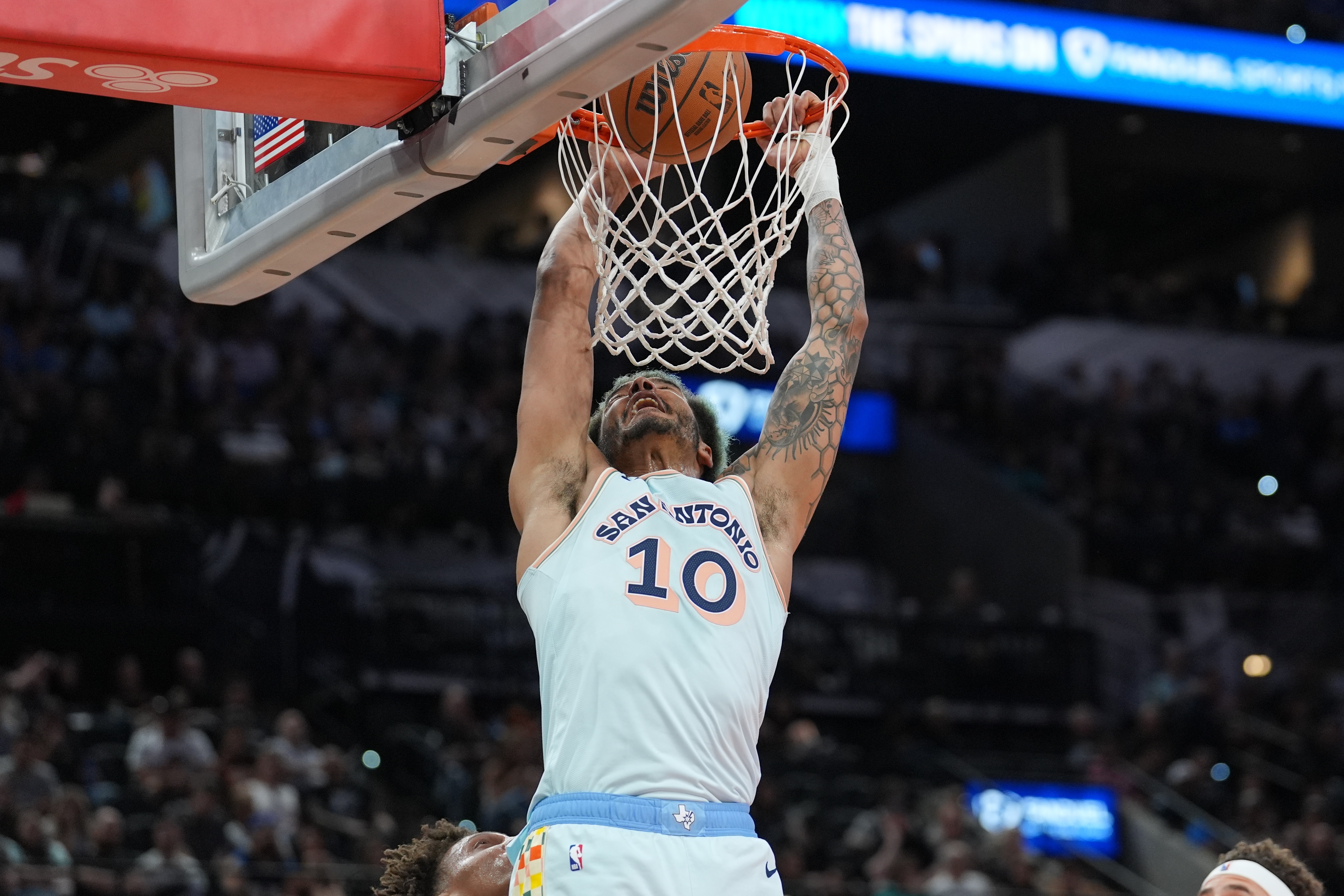 3月22日訊 NBA常規(guī)賽,馬刺128-120擊敗76人。馬刺球員索漢本場(chǎng)比賽打得不錯(cuò),他在場(chǎng)上依舊活力滿滿,不僅拼搶籃板積極,還有上演空接暴扣的精彩表現(xiàn)。他出場(chǎng)35分26秒,17投11中,罰球2中1,拿到賽季新高的23分,另有9籃板2助攻,其中4個(gè)前場(chǎng)板,正負(fù)值+12。 本文標(biāo)簽: 籃球 NBA 馬刺
