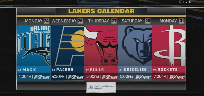 準(zhǔn)備開啟東征!湖人未來5場(chǎng)對(duì)手:魔術(shù)/步行者/公牛/灰熊/火箭