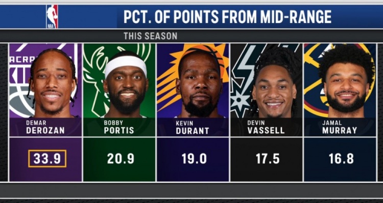 經(jīng)典永不過(guò)時(shí)!本賽季中距離得分占比德羅贊33.9%第一&杜蘭特第三