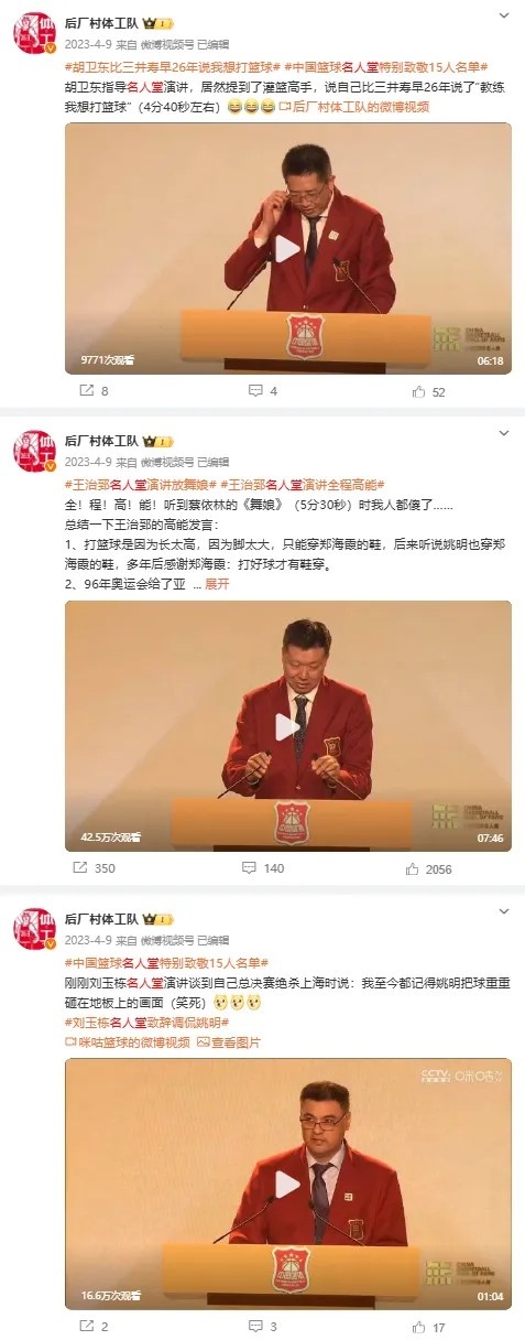 兩年前中國籃球名人堂第一次辦入堂儀式時,我還在老東家為后廠村體工隊玩命,那會我一邊錄屏搶時間搶話題,一邊隔著屏幕感受著那種“新的文化爭在建立”帶來的輕松氣氛: