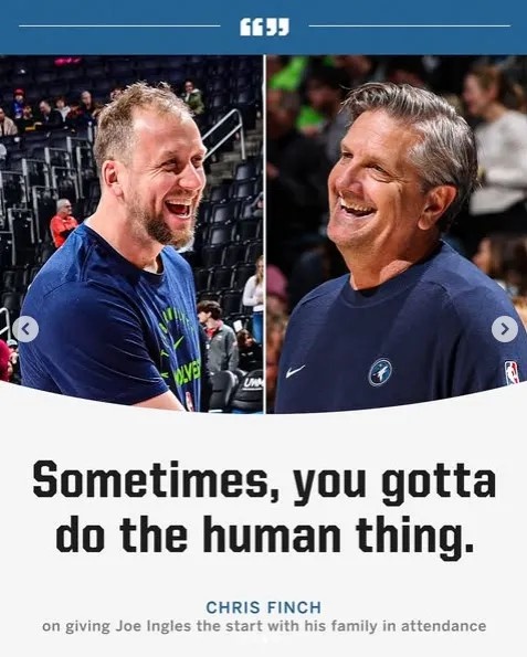 事實(shí)上芬奇也是當(dāng)天早上才決定這樣做的。有人跟他說,如果森林狼能夠在今晚的比賽中取得大比分領(lǐng)先,在大局已定的情況下讓英格爾斯上場會顯得很酷,既是對英格爾斯和他兒子的鼓勵(lì),也有助于凝聚球隊(duì)的士氣。