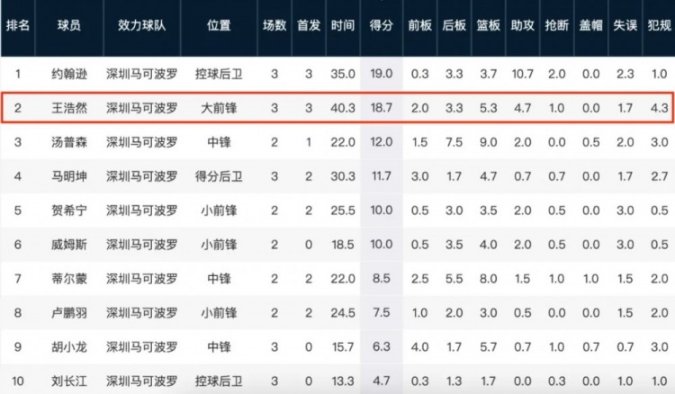 戲份增加的王浩然,產量也無愧于教練組的信任——他場均18.7分僅次于小外援約翰遜的19分,作為本土隊內得分王的同時,另外也有隊內第4的5.3籃板,和第2的4.7次助攻。
