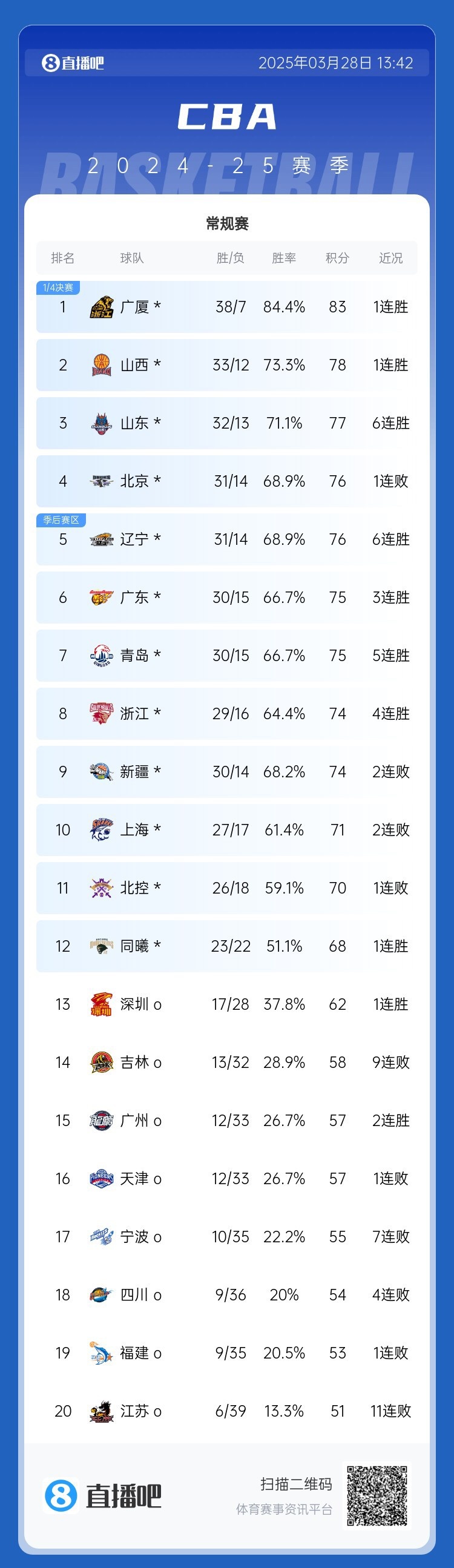 3月28日訊 本賽季常規(guī)賽第45輪昨晚已經(jīng)全部結(jié)束,本輪比賽過后,本賽季的排名形勢進一步明朗。