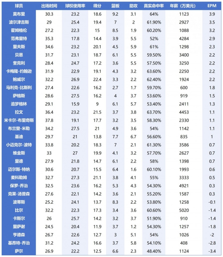 論綜合影響力,具備超強(qiáng)防守影響力的高大內(nèi)線優(yōu)勢(shì)巨大。30位三當(dāng)家EPM排行榜,莫布里、波爾津吉斯和霍姆格倫分列1-3位,他們所效力的球隊(duì)均是本賽季勝率前3位的強(qiáng)隊(duì)??紤]到他們3人攻防兼?zhèn)?,這個(gè)結(jié)果不讓人意外。