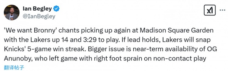 2月2日訊 NBA常規(guī)賽,湖人末節(jié)領(lǐng)先尼克斯兩位數(shù)。據(jù)尼克斯隊(duì)記Ian Begley報(bào)道,比賽第四節(jié)末段,尼克斯主場(chǎng)球迷喊起了“我們要布朗尼”。 本文標(biāo)簽: 籃球 NBA 湖人 布朗尼 尼克斯