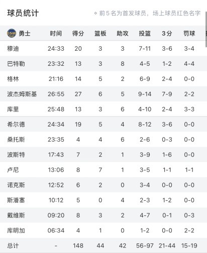 本場(chǎng)比賽勇士早早確立大比分領(lǐng)先,庫里、巴特勒和追夢(mèng)均只出戰(zhàn)3節(jié),勇士出戰(zhàn)13人全部都有得分入賬。