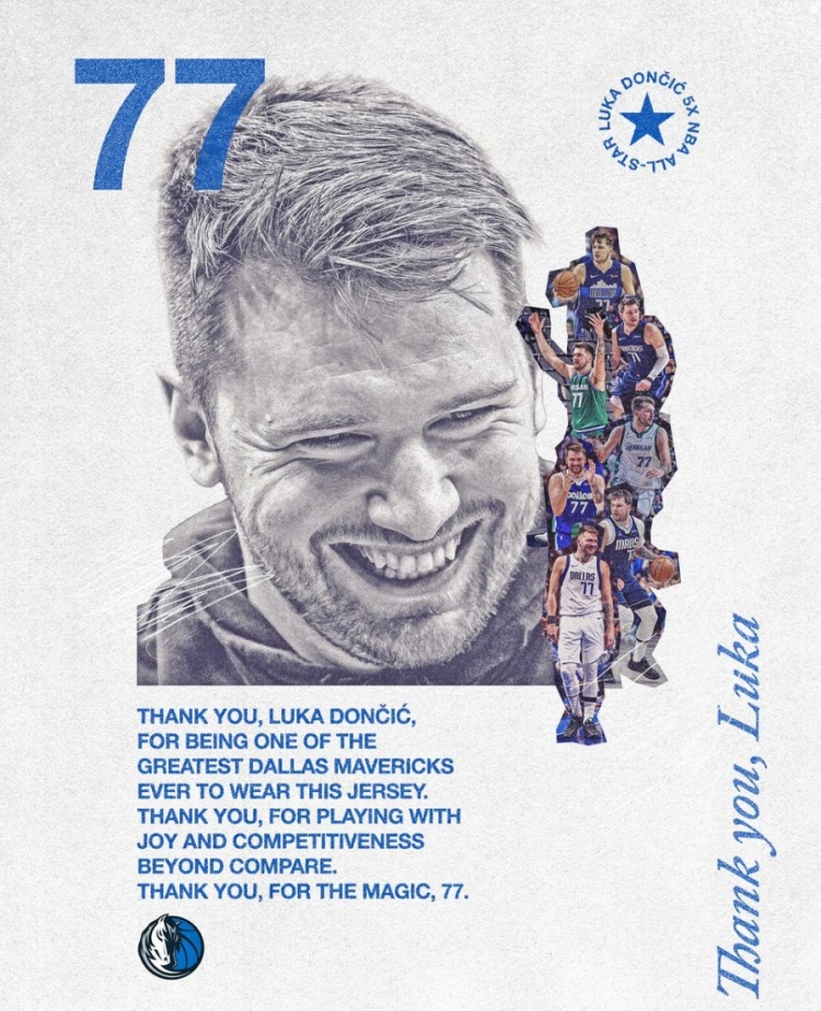 你對于這支球隊和這座城市的影響永遠不會被忘記,77。獨行俠永遠是你的家。感謝盧卡魔法。謝謝。