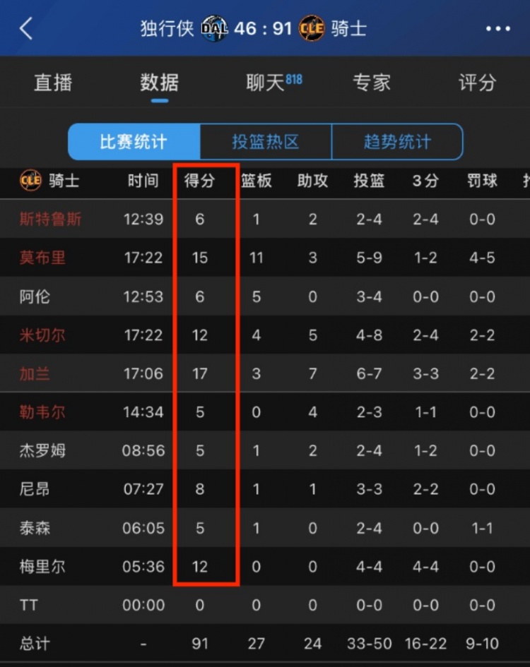 其中,騎士上半場(chǎng)10人進(jìn)入輪換,10人皆有得分入賬,最低分都得到5分,且10人中有4人得分上雙:加蘭17分,小莫布里15分,米切爾和梅里爾都是12分。