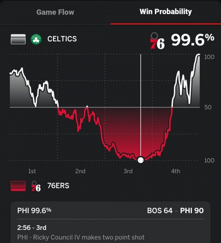2月3日訊 NBA常規(guī)賽,凱爾特人118-110逆轉戰(zhàn)勝76人。比賽第三節(jié)還剩2分56秒時,76人一度領先26分。ESPN數(shù)據(jù)預測顯示,76人當時贏球概率高達99.6%。 本文標簽: 籃球 NBA 76人 凱爾特人