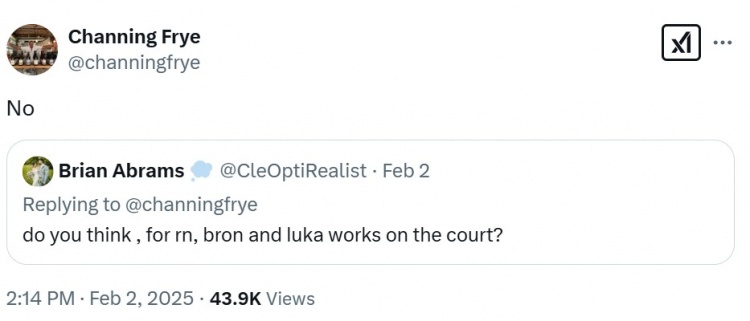 詹姆斯的前隊(duì)友錢寧-弗萊回答網(wǎng)友問答,當(dāng)被問及勒布朗和東契奇的組合在場上能否奏效時(shí),他的回答是不能。