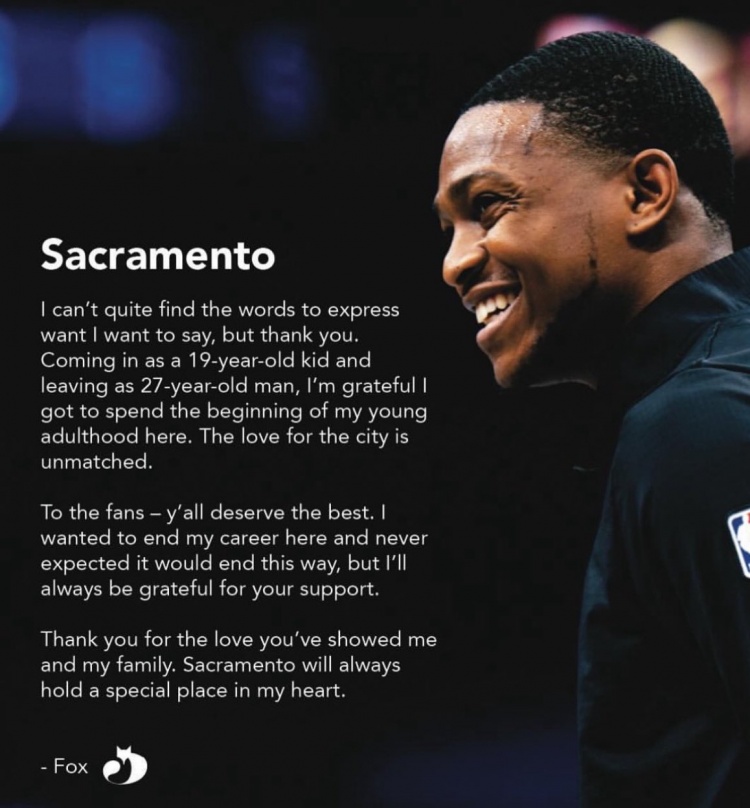 致球迷們,你們理應得到最好的。我本想在這里結束職業(yè)生涯,從未料到會以這樣的方式離開,但我會永遠感激你們的支持。感謝你們給予我和我家人的愛。薩克拉門托在我心中永遠有一個特殊的位置。