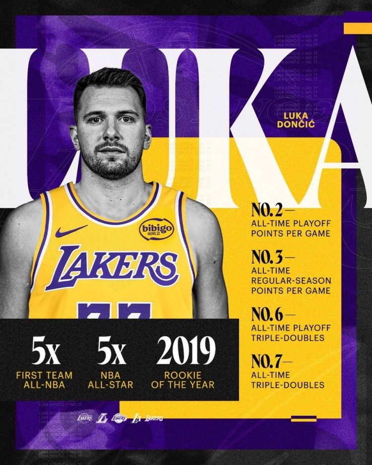- 25歲!湖人曬東契奇履歷:5次一陣&5次全明星 季后賽場(chǎng)均30.9分