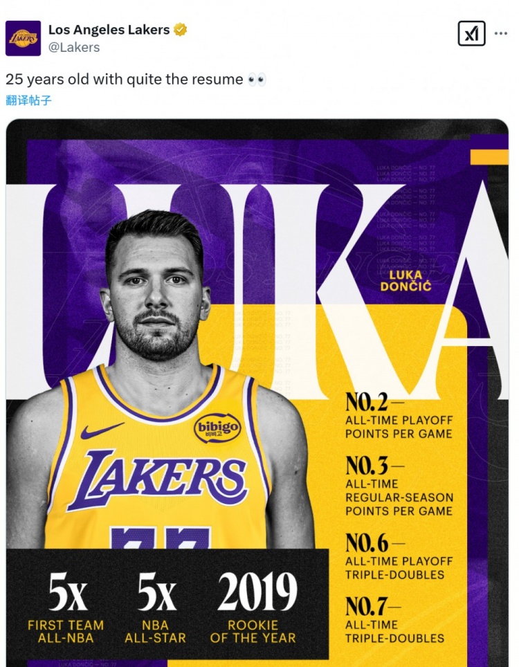 湖人官方曬東契奇履歷:“年僅25歲,履歷豐富????。”