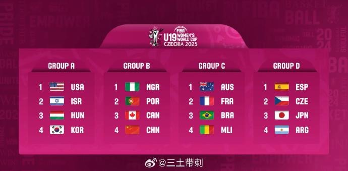 2月4日訊 2025年U19女籃世界杯分組抽簽結(jié)束,中國(guó)女籃分到了B組,同組的有尼日利亞、葡萄牙、加拿大。具體分組如下: