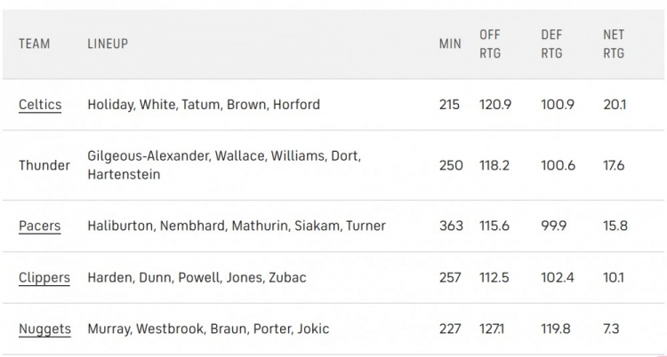 上圖可見:第一名為凱爾特人的霍勒迪、懷特、塔圖姆、杰倫-布朗和霍福德;第二名為雷霆的亞歷山大、華萊士、杰倫-威廉姆斯、多特和哈爾滕施泰因;第三名為步行者的哈利伯頓、內姆哈德、馬瑟林、西亞卡姆和特納;第四名為快船的哈登、鄧恩、鮑威爾、小德里克-瓊斯和祖巴茨;第五名為掘金的穆雷、威少、布勞恩、小波特和約基奇。