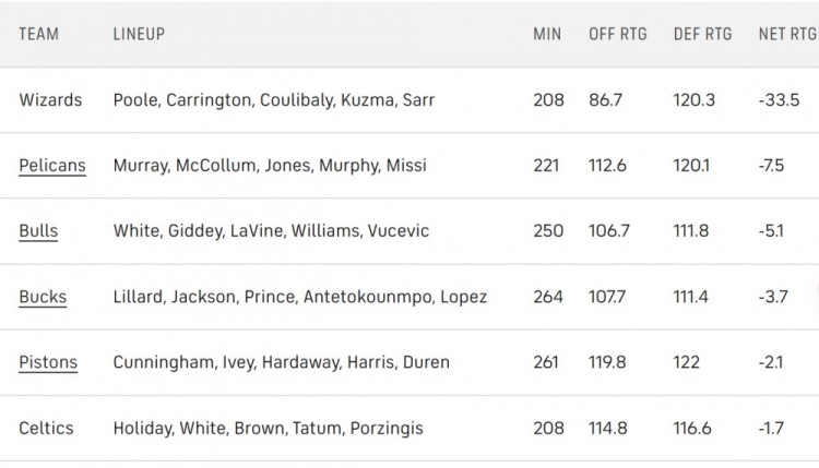 上圖可見:倒數第一為奇才的普爾、卡林頓、庫利巴利、庫茲馬和薩爾;倒數第二為鵜鶘的穆雷、麥科勒姆、特雷-瓊斯、墨菲和米西;倒數第三為公牛的科比-懷特、基迪、拉文、帕威和武切維奇;倒數第四為雄鹿的利拉德、小安德烈-杰克遜、普林斯、字母哥和大洛佩斯;倒數第五為活塞的康寧漢姆、艾維、小哈達威、托拜亞斯-哈里斯和杜倫;倒數第六為凱爾特人的霍勒迪、懷特、杰倫-布朗、塔圖姆和波爾津吉斯。